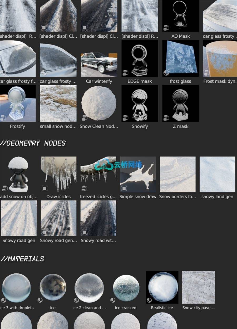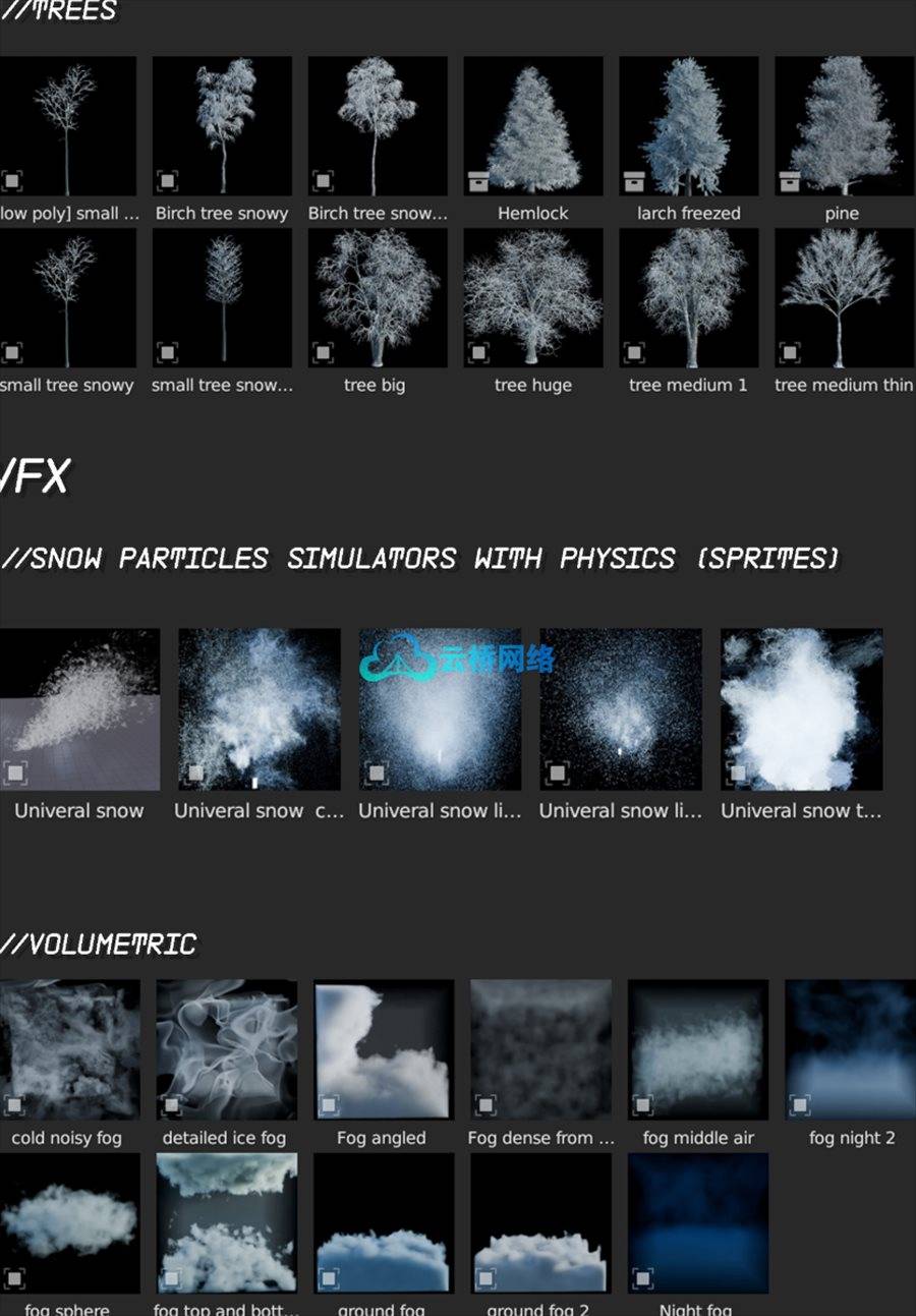 基于几何节点的可定制降雪生成器+雾效资产+支持物理的模拟粒子精灵,为您打造全方位的冬日氛围。