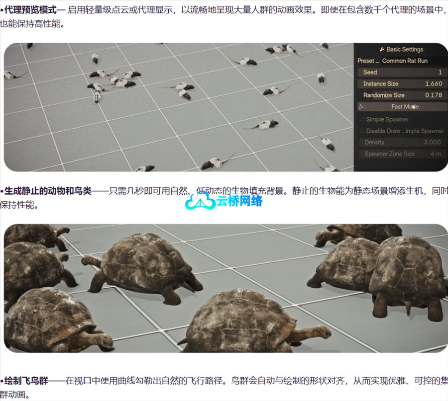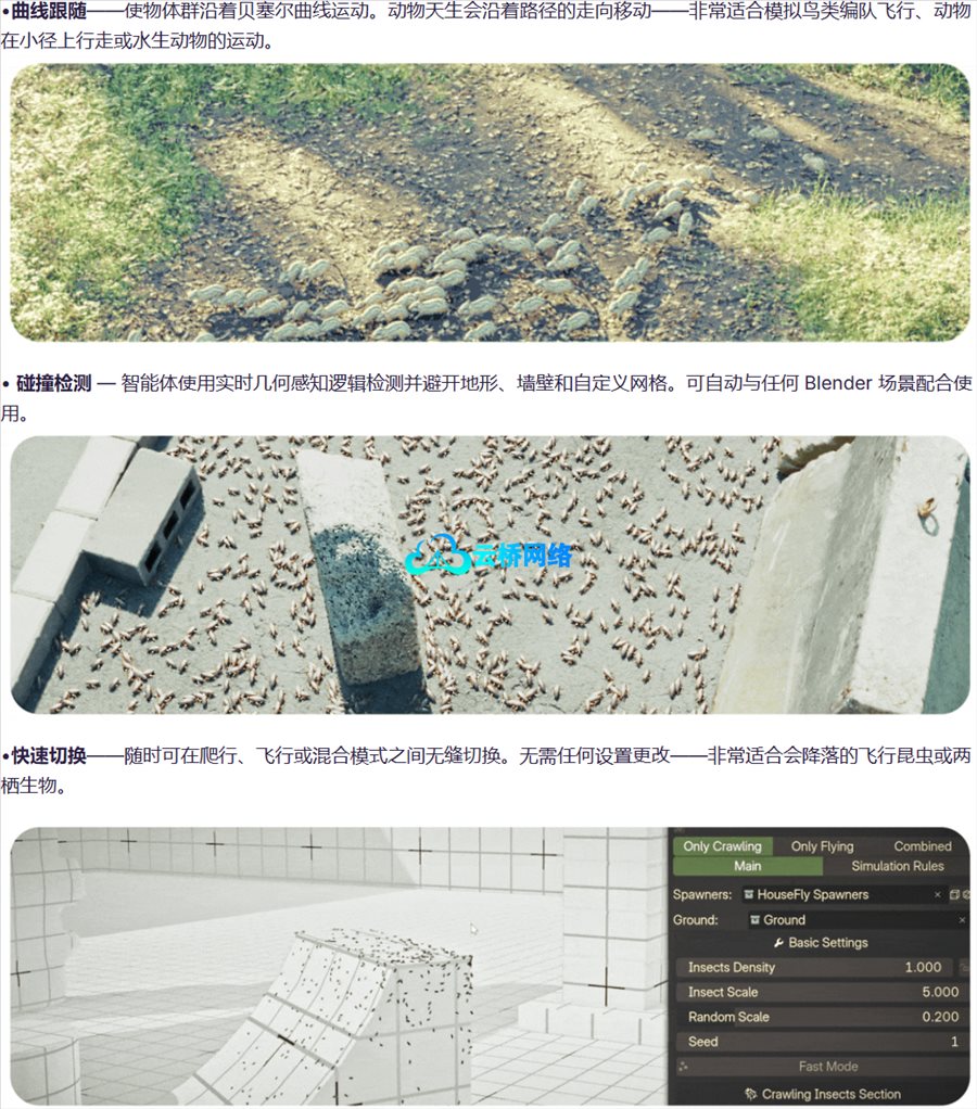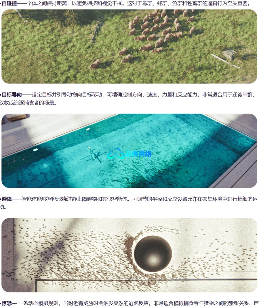 • 自主碰撞规避——个体间自动保持距离,避免拥挤与视觉穿模,重现集群、鱼群、兽群的逼真互动