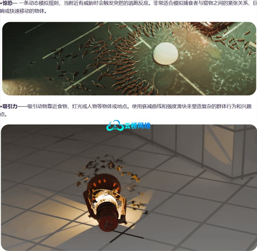 • 吸引力场控制——将动物引导至食物、光源或角色等兴趣点,运用衰减曲线与强度滑块塑造复杂群体行为