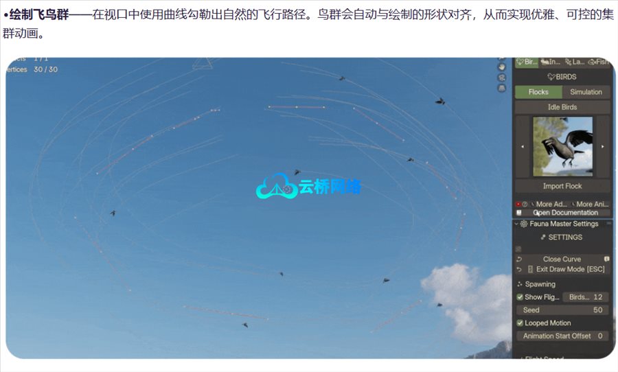 • 手绘鸟群轨迹——在视窗中通过曲线勾勒自然飞行路径,鸟群自动沿绘制形状排列,创造优雅可控的集群动画