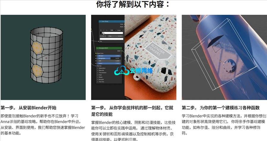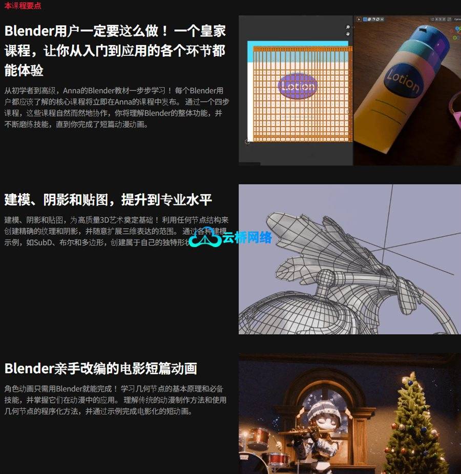 本课程由3D艺术家安娜主讲,通过四个紧密衔接的模块系统传授Blender核心技能:从软件基础与建模着色入门,到高阶硬表面建模与PBR纹理制作,再到着色器节点树构建与动画原理实践,最终整合几何节点与动画工具完成电影级短片创作。课程以“经典路径”为框架,涵盖节点操作、模型构建、材质渲染及角色动画全流程,适合初学者至进阶用户,助力系统掌握Blender从基础到专业的完整创作能力。