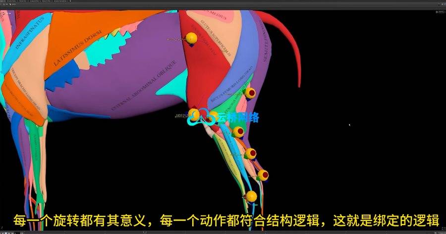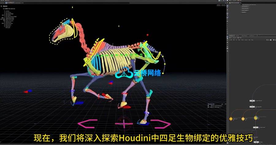 这是一门专注于在Houdini中创建解剖学准确的四足生物绑定课程。学员将从研究真实马匹骨骼结构入手,系统学习通过KineFX和APEX工具集构建程序化的骨骼系统、模拟肌肉行为,并完成从皮肤权重绑定到最终动画测试的全流程。课程历时八周,涵盖解剖学基础、程序化骨架搭建、肌肉变形逻辑及APEX自动化绑定工具运用,最终产出符合生产标准、可导出至Unreal和Maya等引擎的模块化四足动物绑定系统。