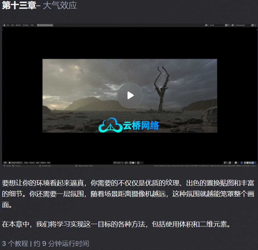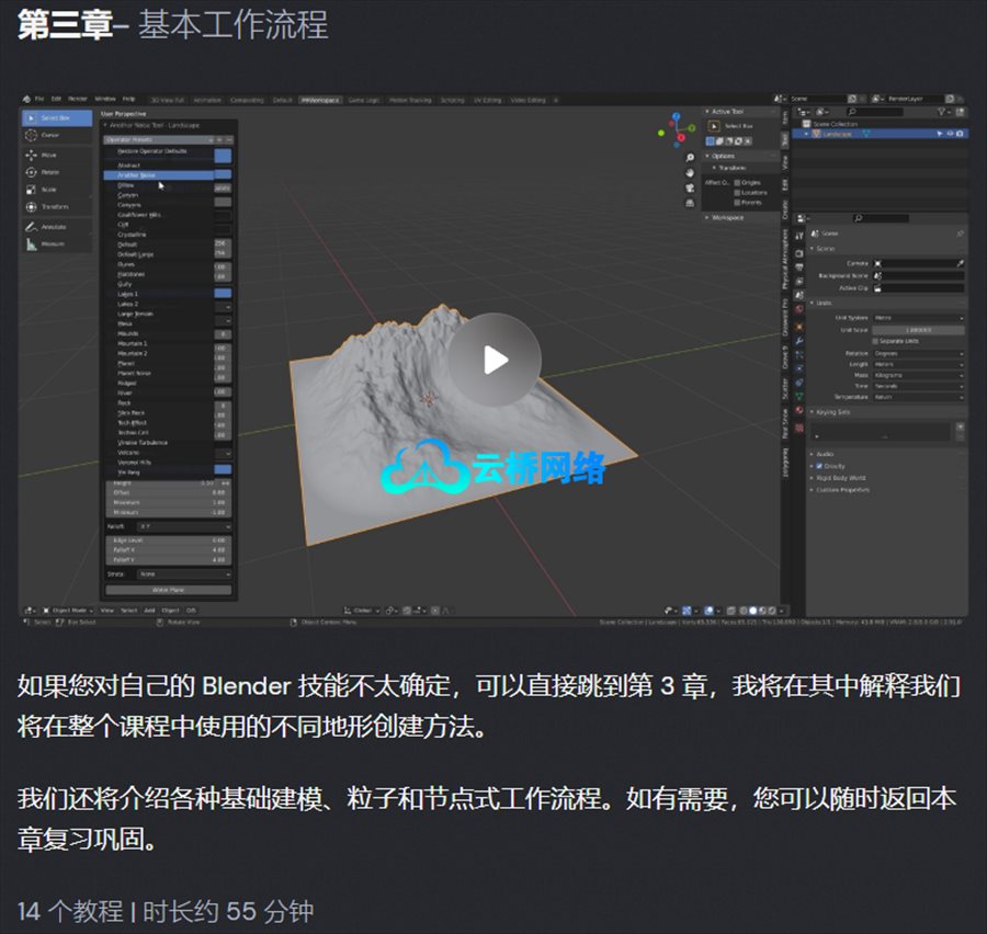 在本课程中,您将学习Blender中景观创建的每一个重要工作流程,而无需使用任何付费附加组件或资产。