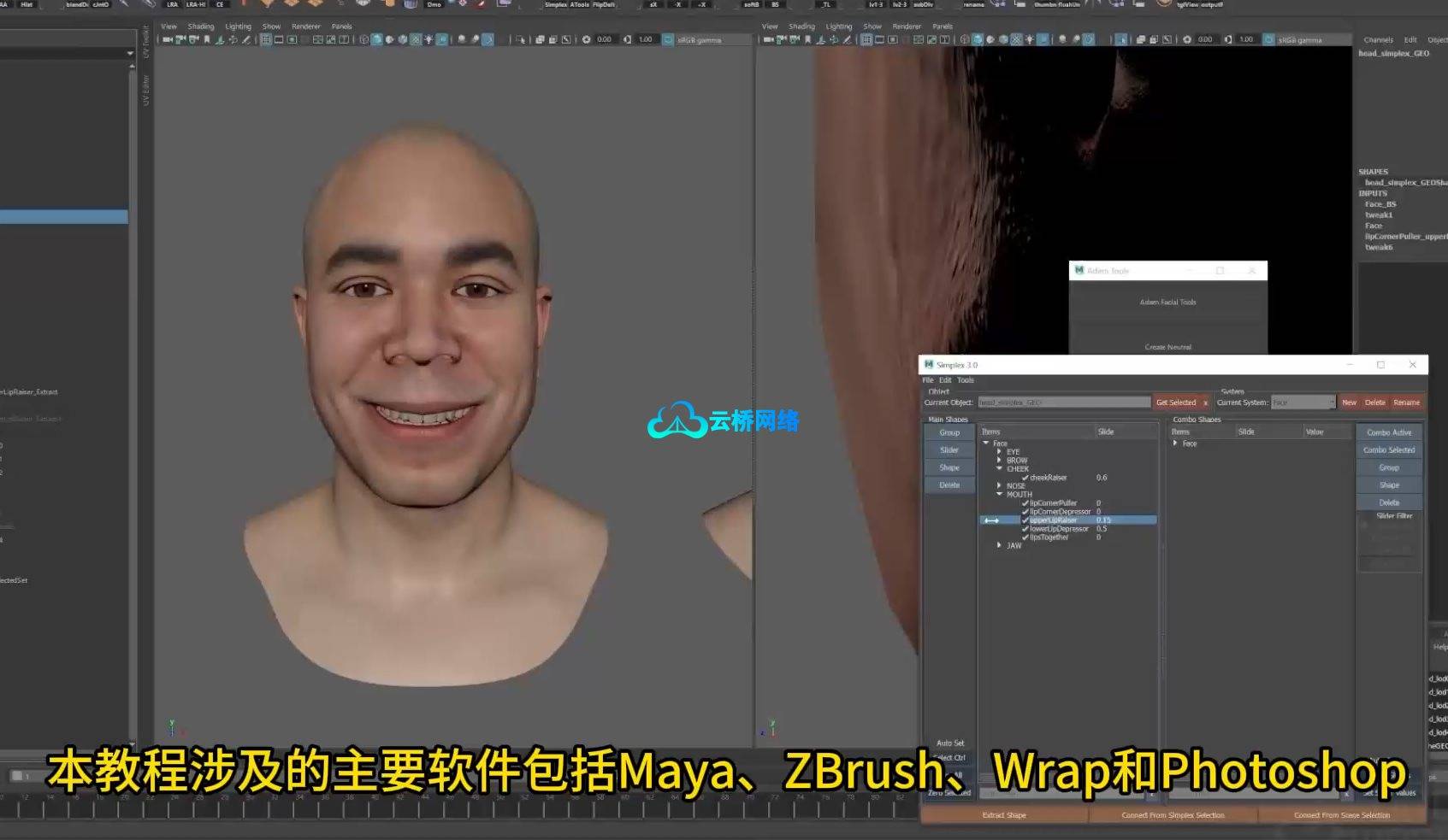 The main software covered in this workshop is Maya, ZBrush, Wrap, and Photoshop. Adam also uses the free Maya plugin, Simplex, which is helpful for organizing all of the facial blend shapes. With this workshop, Adam provides the raw key frame data in the project files for anyone who doesn’t have access to an iPhone.