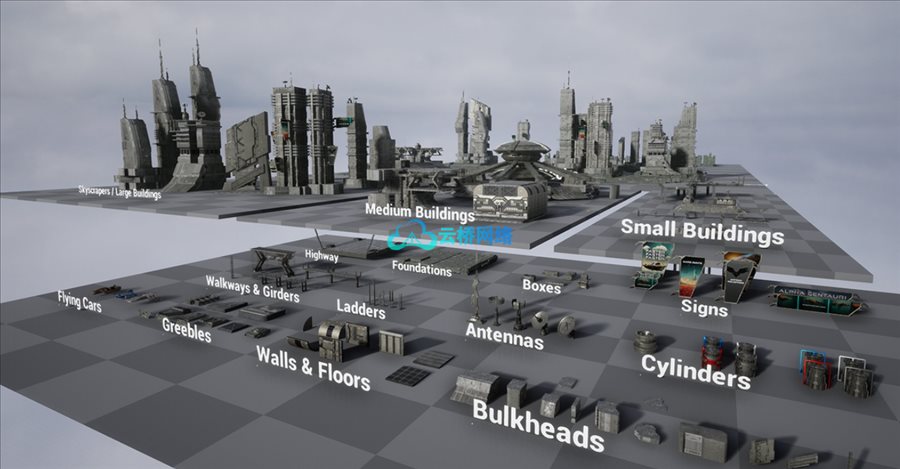 Props and decorations including Crates, Boxes, Antennas, Cannisters, Ladders, Railings, Walkways