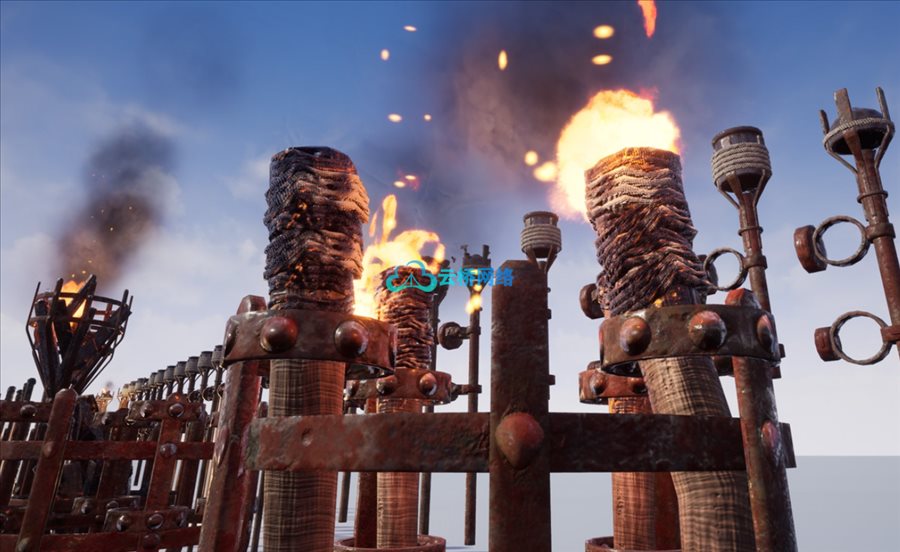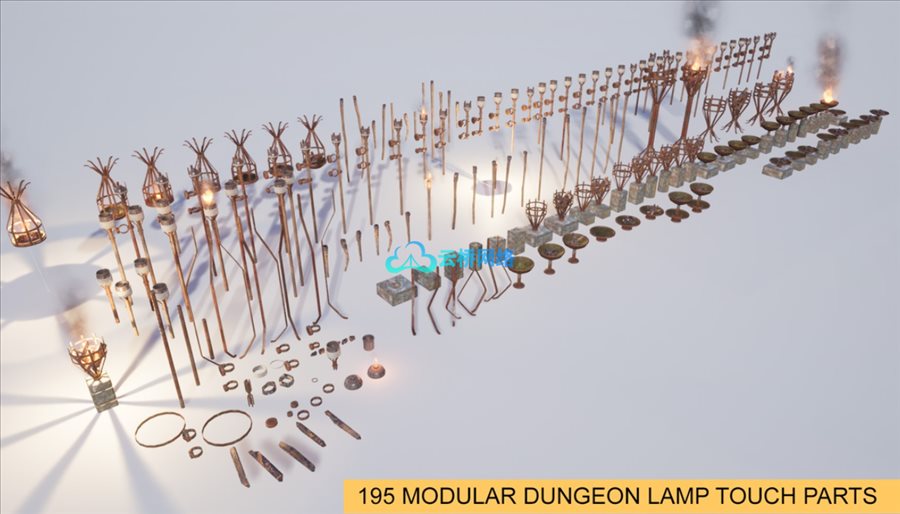 Dungeon Lamps. This pack features 195 modular objects and preassembled dungeon lamps torches and light fixtures. It includes four different PBR material sets to bury the looks of the objects which share all one single texture Atlas in order to make instancing and resource sharing more efficient. The material features the ability to blend between two sets of textures and fade in and out the emissive glow in order to make parts of the mesh look like there are on fire. There are also four different sizes of fire particle systems included which fit the different shapes and sizes of the burning materials of the objects. The pack includes three example Blueprint combining objects, dynamic lights with light functions as well as the particle system and the ability to turn the fire/light on and off. This set comes with textures that have a 8K resolution so that everyone can decide from themselves which mipmap bias they are going to use for the game for example – 2 would be 2048. 技术详情