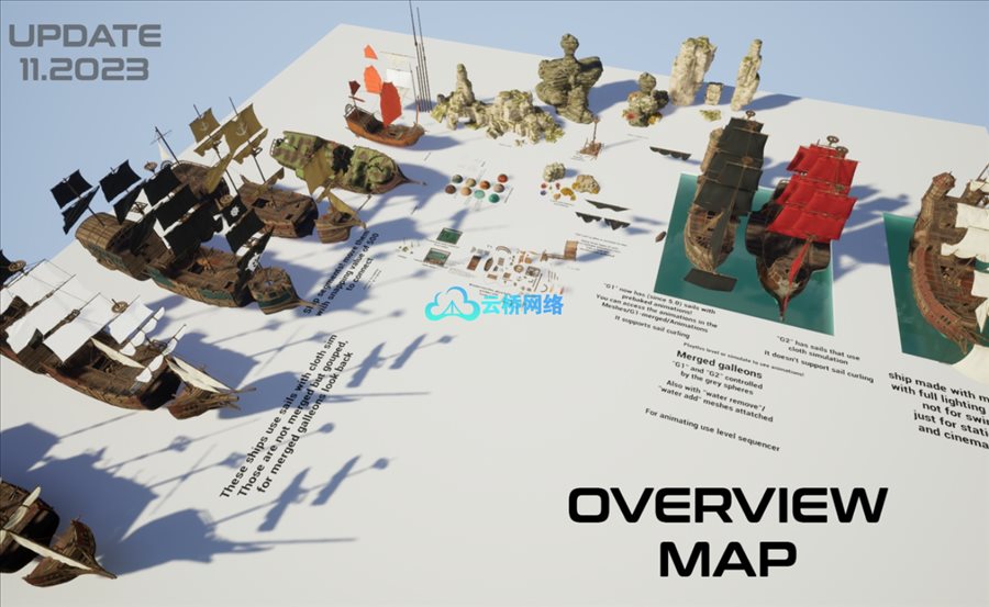 - 船只模型:包括两艘合并的盖伦帆船(G1和G2)和一艘中国式帆船(Chinese Junk)。这些船只不仅拥有精细的网格结构,还配备了动画系统,如帆布的布料模拟和预烘焙动画。