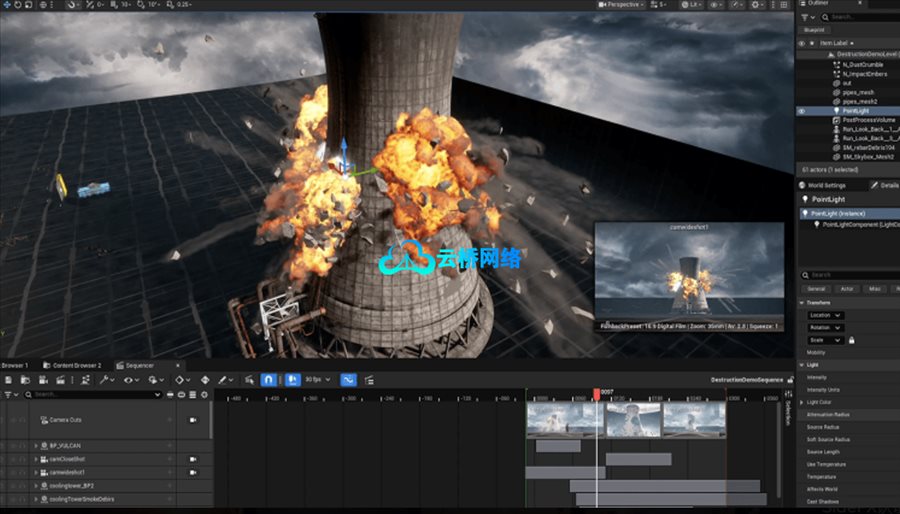 在Unreal中构建环境,进入最终效果打磨阶段。学习使用Sequencer进行镜头剪辑和叙事节奏控制,利用蓝图触发VDB动画,并为破坏场景添加二级特效,完成灯光、构图与电影感氛围的营造。